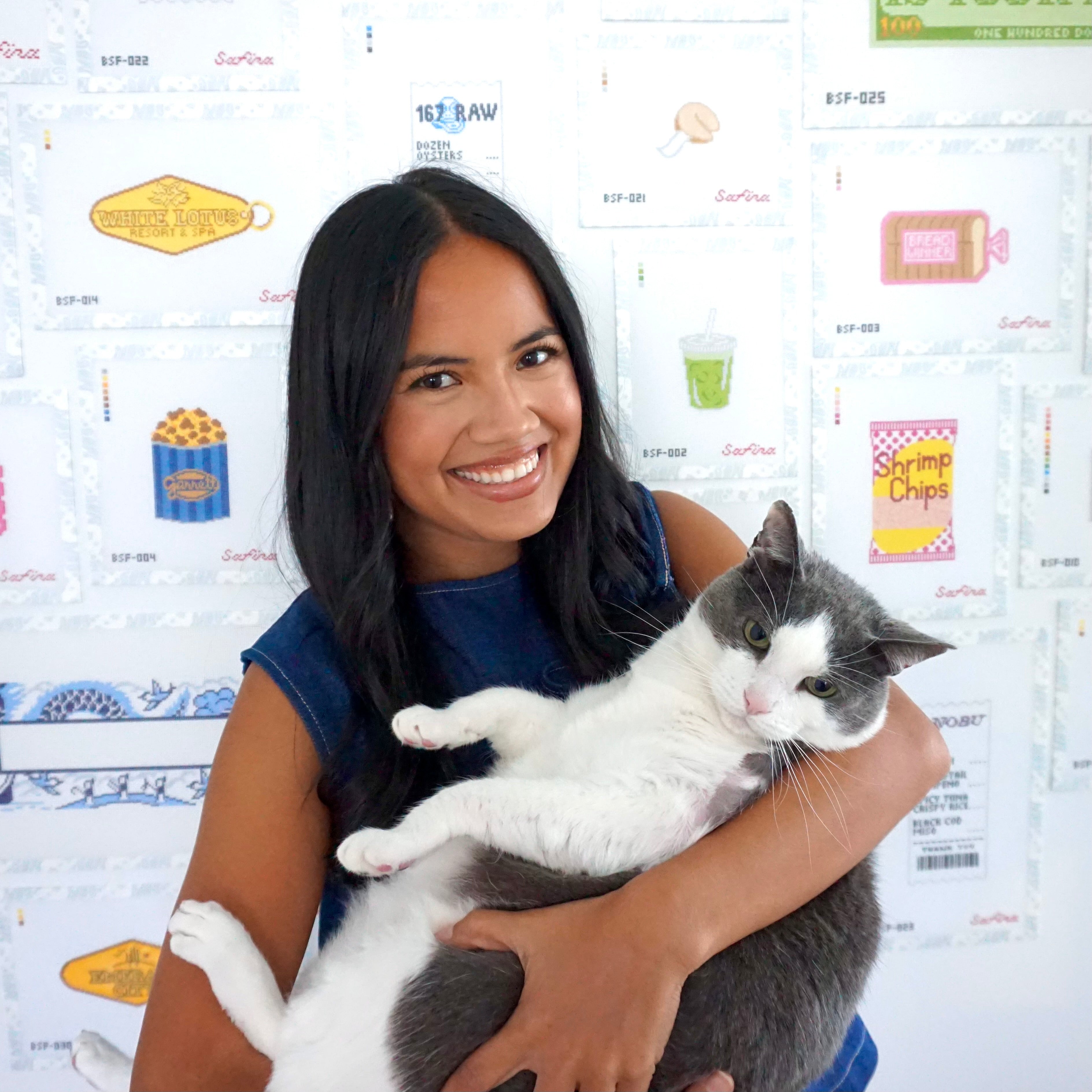 Safira Stitches, an homage to Bella's middle name, brings to life her love of needlepoint and creative expression through playful designs inspired by her Asian culture, favorite foods, travels and trinkets, and pop culture influences.